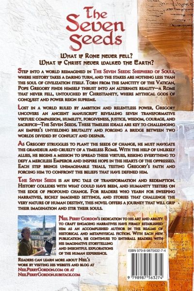 What if Rome never fell? What if Christ never walked the Earth? Step into a world reimagined in The Seven Seeds: Shepherd of Souls, where history takes a daring turn, and the stakes are nothing less than the soul of civilization itself. Torn from the sanctity of the Vatican, Pope Gregory finds himself thrust into an alternate reality-a Rome that never fell, untouched by Christianity, where mythical gods of conquest and power reign supreme. Lost in a world ruled by ambition and relentless power, Gregory uncovers an ancient manuscript revealing seven transformative virtues: compassion, humility, forgiveness, justice, wisdom, courage, and sacrifice-The Seven Seeds. These timeless ideals are key to challenging an empire's unyielding brutality and forging a bridge between two worlds divided by conflict and despair. As Gregory struggles to plant the seeds of change, he must navigate the grandeur and cruelty of a timeless Rome. With the help of unlikely allies, he begins a mission to spread these virtues, risking everything to defy a merciless Emperor and inspire hope in the hearts of the oppressed. Each step brings unimaginable trials, testing Gregory's faith and forcing him to confront the beliefs that have defined him. The Seven Seeds is an epic tale of transformation and redemption. History collides with what could have been, and humanity teeters on the edge of profound change. For readers who yearn for sweeping narratives, richly imagined settings, and stories that challenge the very nature of human destiny, this novel offers a journey that will grip their imagination and stir their souls.