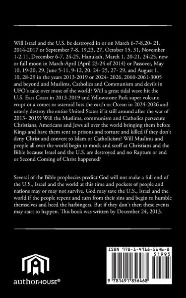 Will Israel and the U.S. be destroyed in or on March 6-7-8,20- 21, 2014-2017 or September 7-8, 19,23, 27, October 15, 31, November 1-2,11, December 6-7, 24-25, Hanukah, March 1, 20-21, 24-25, new or full moon in March-April (April 23-24 of 2014) or Passover, May 10, 19-20, 29, June 5-11, 9-12, 20, 24- 25, 27- 29, and August 1, 10, 28-29 in the years 2013-2019 or 2024- 2026, 2060-2061-3005 and beyond and Muslims, Catholics and Communism and devils in UFO's take over most of the world? Will a great tidal wave hit the U.S. East Coast in 2013-2019 and Yellowstone Park super volcano erupt or a comet or asteroid hits the earth or Ocean in 2024-2026 and utterly destroy the entire United States if it still around after the war of 2013- 2019? Will the Muslims, communism and Catholics persecute Christians, Americans and Jews all over the world bringing them before Kings and have them sent to prisons and torture and killed if they don't deny Christ and convert to Islam or Catholicism? Will Muslims and people all over the world begin to mock and scoff at Christians and the Bible because Israel and the U.S. are destroyed and no Rapture or end or Second Coming of Christ happened? Several of the Bible prophecies predict God will not make a full end of the U.S., Israel and the world at this time and pockets of people and nations may or may not survive. God may save the U.S., Israel and the world if the people repent and turn from their sins and begin to humble themselves and heed the harbingers. But if they don't then these events may start to happen. This book was written by December 24, 2013.