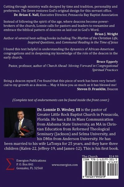 Do you know what it means to be a deacon? Is this office in the church still relevant today? Dr. Lonnie Davis Wesley believes that deacons have an important role to play, but that church traditions and failures in leadership and education have often made deacons ineffective, or given them tasks to which they are not called and for which they are not equipped. He goes back to the first deacons, chosen and set apart in Acts 6, for a model for the ministry of deacons in the modern church. In doing so, he finds that we need to re-learn and re-apply the lessons of scripture and history so that the church can be fully effective in ministry. The Seven: Taking a Closer Look at What It Means to Be a Deacon is a comprehensive guide to reforming and recharging your church's deacon ministry. It includes guides to help you develop an education program to prepare deacons for ministry, and to aid your congregation in supporting that ministry. This book may be read by individuals, but it will find its greatest use as a tool for building a strong deacon ministry in any congregation.