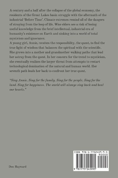 The Seventh Path is the story of the struggles of the residents in the Great lakes basin of North America 150 years after a global economic collapse. A young girl is given the quest to protect knowledge and keep her people from sliding into mystical ignorance. She grows into a mother and a grandmother before she can set out on her quest. In the end, she discovers that she has been on the last path straying from her quest, the seventh erroneous path and through personal suffering discovers the actual purpose of her quest. She then sets out, in sadness and hope, to fulfill that quest.
