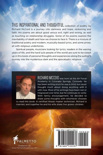 This inspirational and thoughtful collection of poetry by Richard McCoid is a journey into darkness and hope, reckoning and faith. His poems are about good versus evil, right and wrong, as well as touching on relationship struggles. Some of his poems explore the inevitability of death and how we choose to face it. There is a mixture of traditional poetry and modern, musically-based lyrics, and some prose, all with religious undertones. Spiritual people, musicians looking for lyrics, readers in the waning years of life, and the hard luck people of the world are sure to be swept up in this book of personal thoughts and experiences along the author's journey into the mysterious dark and the apocalyptic religious.