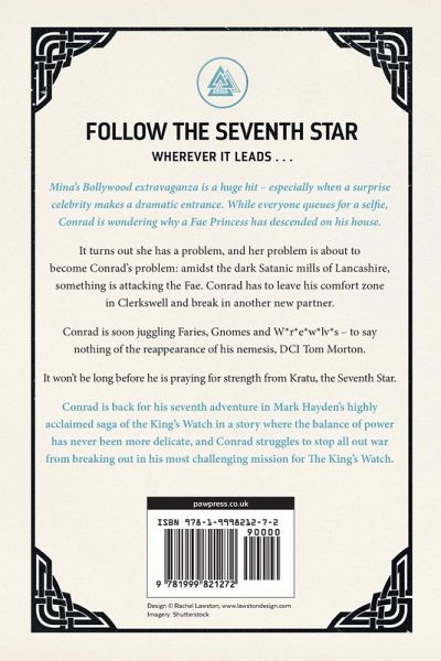 FOLLOW THE SEVENTH STAR Wherever it leads… It was One Hell of a Party Mina’s Bollywood extravaganza is a huge hit – especially when a surprise celebrity makes a dramatic entrance. While everyone queues for a selfie, Conrad is wondering why a Fae Princess has descended on his house. It turns out she has a problem, and her problem is about to become Conrad’s problem: amidst the dark Satanic mills of Lancashire, something is attacking the Fae. Conrad has to leave his comfort zone in Clerkswell and break in another new partner. Conrad is soon juggling Faries, Gnomes and W*r*e*w*lv*s – to say nothing of the reappearance of his nemesis, DCI Tom Morton. It won’t be long before he is praying for strength from Kratu, the Seventh Star. Conrad is back for his seventh adventure in Mark Hayden’s highly acclaimed saga of the King’s Watch in a story where the balance of power has never been more delicate, and Conrad struggles to stop all out war from breaking out in his most challenging mission for THE KING’S WATCH