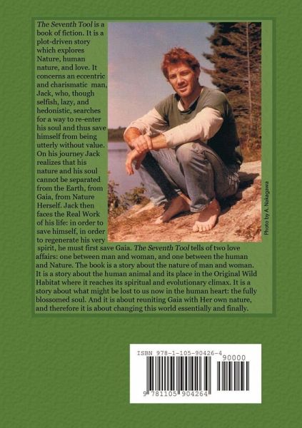 The Seventh Tool explores human value, human nature, and love. It is about an eccentric and charismatic man, Jack, who, though selfish, lazy, and hedonistic, searches for a way to re-enter his soul and thus save himself from being utterly without value. On his journey, he realizes that his nature and his soul cannot be separated from the Earth, from Gaia, from Nature, and thus he faces the real work of his life: in order to save himself, in order to regenerate the human spirit, he must first save Gaia. The book also tells of two love affairs: one between a man and a woman, and another between the human and Nature. It is a story about the nature of man and woman. It is a story about the human animal and his place in the Original Wild Habitat where he reaches his spiritual and evolutionary climax. It is a story about what might be lost to us now in the human heart: the fully blossomed soul. It is about reuniting Gaia with her own nature, and thus it is about changing the world absolutely.