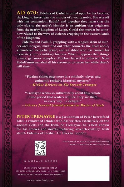 When a murdered corpse of an unknown young noble is discovered, Fidelma of Cashel is brought in to investigate, in Peter Tremayne's The Seventh Trumpet Ireland, AD 670. When the body of a murdered young noble is discovered not far from Cashel, the King calls upon his sister, Fidelma, and her companion Eadulf to investigate. Fidelma, in addition to being the sister of the king, is a dailaigh-an advocate of the Brehon Law Courts-and has a particular talent for resolving the thorniest of mysteries. But this time, Fidelma and Eadulf have very little to work with-the only clue to the noble's identity is an emblem originating from the nearby kingdom of Laign. Could the murder be somehow related to the wave of violence erupting in the western lands of the kingdom? The turmoil there is being stirred up by an unknown fanatical figure who claims to have been summoned by "the seventh angel" to remove the "impure of faith." Fidelma and Eadulf, once again grappling with a tangled skein of murder and intrigue, must somehow learn what connects the dead noble, a murdered alcoholic priest, and an abbot who has turned his monastery into a military fortress. When it appears that things cannot get more complex, Fidelma herself is abducted, and Eadulf must rescue her before the mystery can be solved.