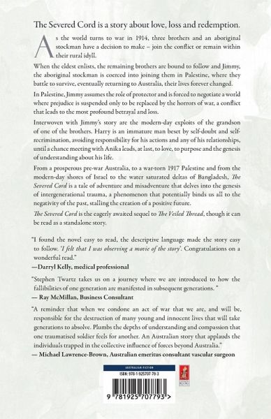 The Severed Cord is a story about love, loss and redemption. As the world turns to war in 1914, three brothers and an aboriginal stockman have a decision to make - join the conflict or remain within their rural idyll. When the eldest enlists, the remaining brothers are bound to follow and Jimmy, the aboriginal stockman is coerced into joining them in Palestine, where they battle to survive, eventually returning to Australia, their lives forever changed. In Palestine, Jimmy assumes the role of protector and is forced to negotiate a world where prejudice is suspended only to be replaced by the horrors of war, a conflict that leads to the most profound betrayal and loss. Interwoven with Jimmy's story are the modern-day exploits of the grandson of one of the brothers. Harry is an immature man beset by self-doubt and self-recrimination, avoiding responsibility for his actions and any of his relationships, until a chance meeting with Anika leads, at last, to love, to purpose and the genesis of understanding about his life. From a prosperous pre-war Australia, to a war-torn 1917 Palestine and from the modern-day shores of Israel to the water saturated deltas of Bangladesh, The Severed Cord is a tale of adventure and misadventure that delves into the genesis of intergenerational trauma, a phenomenon that potentially binds us all to the negativity of the past, stalling the creation of a positive future. The Severed Cord is the eagerly awaited sequel to The Veiled Thread, though it can be read as a standalone story.