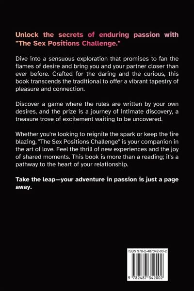 Break free from the routine and rekindle the magic of passion! Has monotony crept into your bedroom? Has the passion of the early days faded? Or maybe you want to add some spice and intimacy to your relationship? Dive into "The Sex Positions Challenge ! Much more than a simple guide to positions, "The Sex Positions Challenge" is a sensual adventure that will strengthen your bond while injecting a new dose of excitement into your relationship. "The Sex Positions Challenge" offers:A fresh take on the Kamasutra, tailored to modern couples. A point-based game that lets you progress at your own pace within your relationship. Romantic and sensual rewards at each key milestone. A quiz to help you understand your partner's deep desires and boundaries. 69 positions, from novice to expert, complete with detailed descriptions and vibrant illustrations. Tips for enhancing your comfort or trying variations for each position. A guarantee of (re)discovery, laughter, and closeness with your partner. The perfect gift for a naughty Christmas, a steamy Valentine's Day, an anniversary, or just to rekindle the flame! Ready to transform your intimacy and merge with your partner in a new way? Don't let this opportunity slip away. Order your Sex Positions Challenge" now!