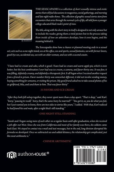 THE SEXSCAPADES is a collection of short sexually intense and erotic stories that will fuel discussions in magazines, social gatherings, and morning and late night radio shows. The collection of graphic sexual stories stem from encounters that arise through the normal cycle of life; all told from a younger college educated black male?s point of view. The title, along with the short story in itself is designed to not only arouse but to include the reader, giving them a vivid picture but in the process taking them inside of how an adventure develops; how it even begins, and the meaning behind it. The Sexscapades show how a chance or planned meeting ends in a sexual act; acts such as a one night stand, sex at the office, sex and sports, sexual fantasies, sex with former lovers, good-bye sex, accidental sex, sex with an older woman, and sex with a second cousin. ?I have had ice cream and cake, which is good. I have had ice cream and warm apple pie, which is even better; but the best combination I ever had was ice cream, a camera, and favor thirty-one. It was fun; it was filling, definitely creamy, and definitely a therapeutic first. It all began when I received another request from a friend in prison. Favor number thirty was somewhat different; it did not involve sending money, buying something for someone, or visiting the prison. My good friend asked me to take sexual photos of his ex-girlfriend, Mia, and send them to him. That was favor thirty? -31 FAVORS AND ICE CREAM ?After they both fell asleep together, they never spent more than a day apart. ?That is deep,? said Karl. ?Ivory,? pausing to recall,? Ivory, that?s the same Ivory he married?? ?You got it, so, you do what you feel, but I just wanted you to know, there are two sides to stories like yours,? I added. With that, Karl realized he had found his soul mate, after a night that?s still standing.? - ONE NIGHT STILL STANDING ?Sarah and I began seeing more of each other on a regular basis until after graduation, when she received a job offer out West. Since she was from California and most of her family was there, she seldom came back East. We stayed in contact via e-mail and text messages, but in the end, long division disrupted the formula we developed. Once we subtracted sex and added distance, the relationship got complicated, just like most arithmetic is.? -CHINESE ARITHMETIC
