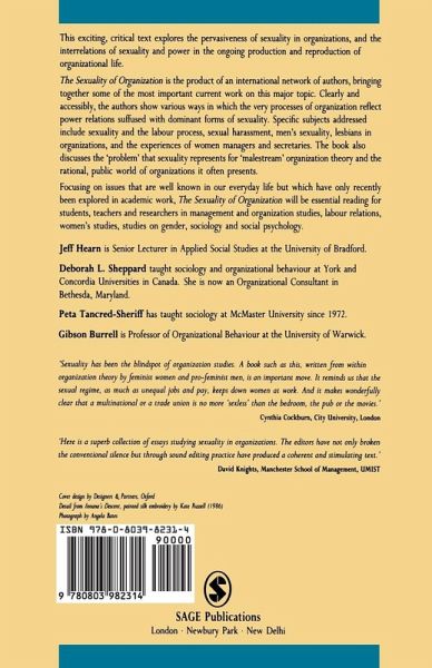 `Sexuality has been the blindspot of organization studies. It has been as though the human beings who inhabit and shape organizations - who determine their structures, lay down their rules and live their cultures - leave their desires at home. A book such as this, written from within organization theory by feminist women and pro-feminist men, is an important move. It invites a rethink of all that one-dimensional stuff about power. It reminds us that the sexual regime, as much as unequal jobs and pay, keeps down women at work. And it makes wonderfully clear that a multinational or trade union is no more `sexless' than the bedroom, the pub or the movies.' - Cynthia Cockburn