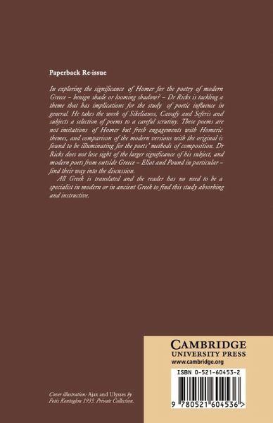 In exploring the significance of Homer for the poetry of modern Greece - benign shade or looming shadow? - Dr Ricks is tackling a theme that has implications for the study of poetic influence in general. He takes the work of Sikelianos, Cavafy and Seferis and subjects a selection of poems to a careful scrutiny. These poems are not imitations of Homer but fresh engagements with Homeric themes, and comparison of the modern versions with the original is found to be illuminating for the poets' methods of composition. Dr Ricks does not lose sight of the larger significance of his subject, and modern poets from outside Greece - Eliot and Pound, in particular - find their way into the discussion. All Greek is translated and the reader has no need to be a specialist in modern or in ancient Greek to find this study absorbing and instructive.