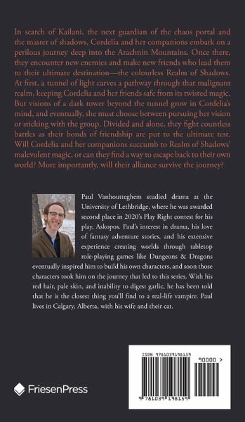 In search of Kailani, the next guardian of the chaos portal and the master of shadows, Cordelia and her companions embark on a perilous journey deep into the Arachnin Mountains. Once there, they encounter new enemies and make new friends who lead them to their ultimate destination-the colourless Realm of Shadows. At first, a tunnel of light carves a pathway through that malignant realm, keeping Cordelia and her friends safe from its twisted magic. But visions of a dark tower beyond the tunnel grow in Cordelia's mind, and eventually, she must choose between pursuing her vision or sticking with the group. Divided and alone, they fight countless battles as their bonds of friendship are put to the ultimate test. Will Cordelia and her companions succumb to Realm of Shadows' malevolent magic, or can they find a way to escape back to their own world? More importantly, will their alliance survive the journey?