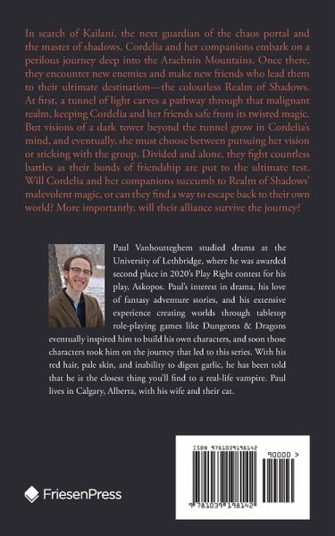 In search of Kailani, the next guardian of the chaos portal and the master of shadows, Cordelia and her companions embark on a perilous journey deep into the Arachnin Mountains. Once there, they encounter new enemies and make new friends who lead them to their ultimate destination-the colourless Realm of Shadows. At first, a tunnel of light carves a pathway through that malignant realm, keeping Cordelia and her friends safe from its twisted magic. But visions of a dark tower beyond the tunnel grow in Cordelia's mind, and eventually, she must choose between pursuing her vision or sticking with the group. Divided and alone, they fight countless battles as their bonds of friendship are put to the ultimate test. Will Cordelia and her companions succumb to Realm of Shadows' malevolent magic, or can they find a way to escape back to their own world? More importantly, will their alliance survive the journey?