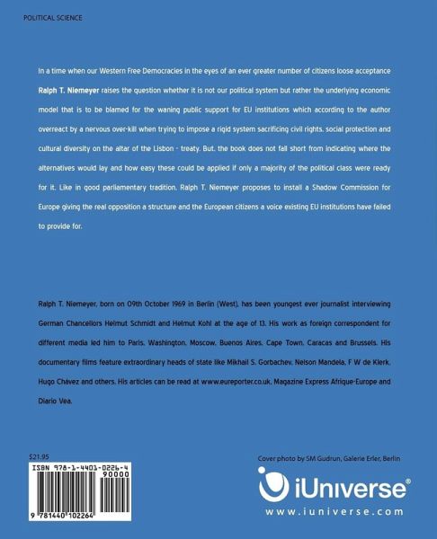 In a time when our Western Free Democracies in the eyes of an ever greater number of citizens loose acceptance Ralph T. Niemeyer raises the question whether it is not our political system but rather the underlying economic model that is to be blamed for the waning public support for EU institutions which according to the author overreact by a nervous over-kill when trying to impose a rigid system sacrificing civil rights, social protection and cultural diversity on the altar of the Lisbon - treaty. But, the book does not fall short from indicating where the alternatives would lay and how easy these could be applied if only a majority of the political class were ready for it. Like in good parliamentary tradition, Ralph T. Niemeyer proposes to install a Shadow Commission for Europe giving the real opposition a structure and the European citizens a voice existing EU institutions have failed to provide for.