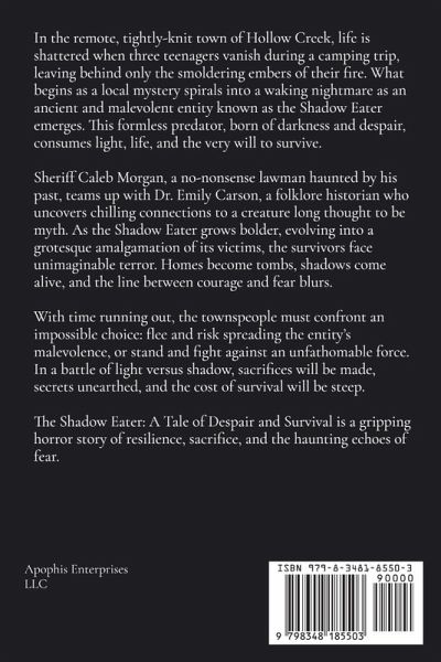 In the remote, tightly-knit town of Hollow Creek, life is shattered when three teenagers vanish during a camping trip, leaving behind only the smoldering embers of their fire. What begins as a local mystery spirals into a waking nightmare as an ancient and malevolent entity known as the Shadow Eater emerges. This formless predator, born of darkness and despair, consumes light, life, and the very will to survive. Sheriff Caleb Morgan, a no-nonsense lawman haunted by his past, teams up with Dr. Emily Carson, a folklore historian who uncovers chilling connections to a creature long thought to be myth. As the Shadow Eater grows bolder, evolving into a grotesque amalgamation of its victims, the survivors face unimaginable terror. Homes become tombs, shadows come alive, and the line between courage and fear blurs. With time running out, the townspeople must confront an impossible choice: flee and risk spreading the entity's malevolence, or stand and fight against an unfathomable force. In a battle of light versus shadow, sacrifices will be made, secrets unearthed, and the cost of survival will be steep. The Shadow Eater: A Tale of Despair and Survival is a gripping horror story of resilience, sacrifice, and the haunting echoes of fear.