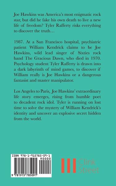 Joe Hawkins was America's most enigmatic rock star, but did he fake his own death to live a new life of freedom? Tyler Rafferty risks everything to discover the truth... 1987. At a San Francisco hospital, psychiatric patient William Kendrick claims to be Joe Hawkins, wild lead singer of Sixties rock band The Gracious Dawn, who died in 1970. Psychology student Tyler Rafferty is drawn into a dark labyrinth of mind games, to discover if William really is Joe Hawkins or a dangerous fantasist and master manipulator. Los Angeles to Paris, Joe Hawkins' extraordinary life story emerges, rising from humble poet to decadent rock idol. Tyler is running on lost time to solve the mystery of William Kendrick's identity and uncover an explosive secret hidden from the world.
