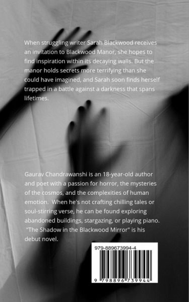 A decaying mansion. A haunting past. A darkness that refuses to die. When struggling writer Sarah Blackwood seeks refuge in the secluded Blackwood Manor, she hopes to find inspiration within its crumbling walls. But the manor holds secrets more terrifying than she could have imagined, and Sarah soon finds herself trapped in a chilling nightmare. Haunted by eerie whispers, shadowy figures, and a malevolent creature that lurks in the darkness, Sarah must confront her deepest fears and unravel the mysteries of Blackwood Manor before they consume her. But as she delves deeper into the shadows, she discovers a connection to the manor's dark history that spans lifetimes, a connection that could hold the key to her salvation... or her ultimate demise.