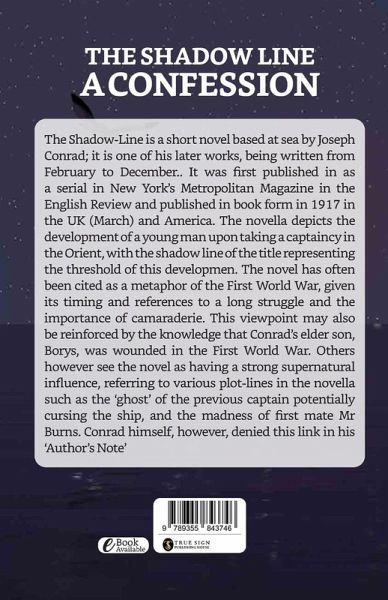 The Shadow-Line is a short novel based at sea by Joseph Conrad; it is one of his later works, being written from February to December.. It was first published in as a serial in New York's Metropolitan Magazine in the English Review and published in book form in 1917 in the UK (March) and America. The novella depicts the development of a young man upon taking a captaincy in the Orient, with the shadow line of the title representing the threshold of this developmen The novel has often been cited as a metaphor of the First World War, given its timing and references to a long struggle and the…mehr