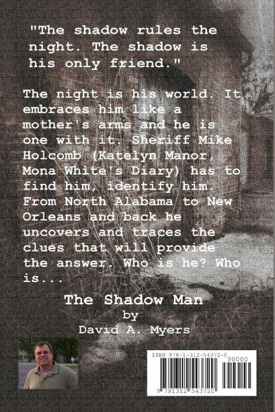"The shadow rules the night. The shadow is his only friend." Sheriff Mike Holcomb, retired, (Katelyn Manor, Mona White's Diary) has been brought back by the county to do what he does best, investigate. He finds help from an unusual source, the mysterious Carmen Ducote, a retired linguist from New Orleans. From North Alabama to New Orleans and back they discover and solve the clues that they hope will answer the question. "Who is he? Who is... the shadow man?"