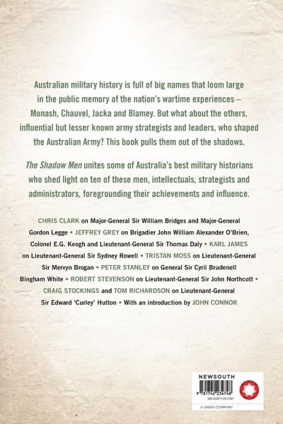 The Shadow Men brings together some of Australia's best military historians to shed light on ten of these men and to bring their achievements and influence into the foreground.