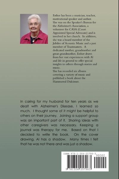 In caring for my husband for ten years as we dealt with Alzheimer's Disease, I learned so much. I thought some of it might be helpful to others on their journey. Joining a support group was an important part of it. Sharing ideas with other caregivers was necessary. Keeping a journal was therapy for me. Based on that I decided to write the book. On the cover drawing, Al has a shadow. Many times I felt that he was not there and was just a shadow.