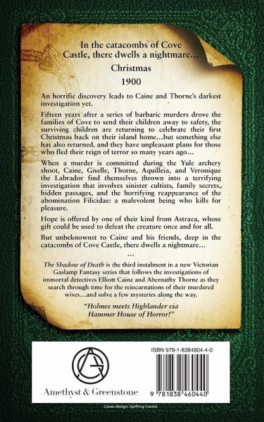 Christmas 1900 An horrific discovery leads to Caine and Thorne's darkest investigation yet. Fifteen years after a series of barbaric murders drove the families of Cove to send their children away to safety, the surviving children are returning to celebrate their first Christmas back on their island home...but something else has also returned, and they have unpleasant plans for those who fled their reign of terror so many years ago... When a murder is committed during the Yule archery shoot, Caine, Giselle, Thorne, Aquilleia, and Veronique the Labrador find themselves thrown into a terrifying investigation that involves sinister cultists, family secrets, hidden passages, and the horrifying reappearance of the abomination Filicidae: a malevolent being who kills for pleasure. Hope is offered by one of their kind from Astraea, whose gift could be used to defeat the creature once and for all. But unbeknownst to Caine and his friends, deep in the catacombs of Cove Castle, there dwells a nightmare... The Shadow of Death is the third instalment in a new Victorian Gaslamp Fantasy series that follows the investigations of immortal detectives Elliott Caine and Abernathy Thorne as they search through time for the reincarnations of their murdered wives...and solve a few mysteries along the way. "Holmes meets Highlander via Hammer House of Horror!"