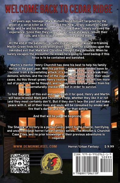 Ten years ago, teenager Mark Watson found himself targeted by the ghost of a serial killer as it terrorized the New Jersey suburb of Cedar Ridge. He and his then-girlfriend, Christine Baker, barely survived the experience. Since then they've gone their separate ways, rebuilt their lives, and tried to put those horrors behind them. At the end of the pandemic, private investigator and wizard-in-training Martin Green finds his celebration short-lived when he stumbles upon the rekindled evil that Mark and Christine thought they defeated. When he barely escapes the encounter, he knows he's going to need backup if this force is to be contained and banished. Martin's mentor Henry Churchill has done his best to help his family thrive in the past year. With his partner Lexie on an extended leave to recover from a devastating attack, it's been good to have a break from demons, witches, and the rest of the insanity that comes with their usual cases. As this threat grows Henry realizes the time off has left him more out of practice than he thought, and he may have to draw power from his own supernaturally checkered past in order to survive. To find the origin of this evil and extinguish it for good, Henry and Martin will have to enlist Mark and Christine's help, whether they like it or not (and they most certainly don't). But if they don't face the past and make peace with it, all of their lives and souls will be consumed by smoke and fire that's darker and hungrier than before. And that will be just the beginning... The Shadow of Victory is a perfect entry point to the chaotic, horrifying, and unconventional horror/urban fantasy series, The Winston & Churchill Case Files, and no prior knowledge of their previous adventures is required.