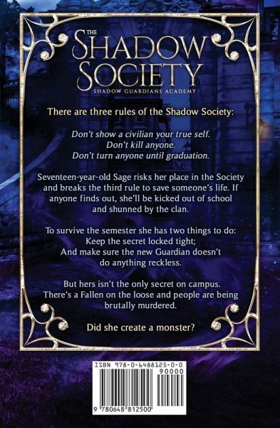 There are three rules of the Shadow Society: Don't show a civilian your true self. Don't kill anyone. Don't turn anyone until graduation. Seventeen-year-old Sage risks her place in the Society and breaks the third rule to save someone's life. If anyone finds out, she'll be kicked out of school and shunned by the clan. To survive the semester she has two things to do: Keep the secret locked tight; And make sure the new Guardian doesn't do anything reckless. But hers isn't the only secret on campus. There's a Fallen on the loose and people are being brutally murdered. Did she create a monster?