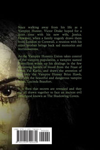 Since walking away from his life as a Vampire Hunter, Victor Drake hoped for a quiet time with his new wife, Jessica. However, when a family tragedy draws them from London to Cornwall, a reunion with his older brother brings back sad memories and recriminations. As the Vampire Hunters Union takes control of the vampire population, a vampire named Vermillion winds up his dealings in the few remaining barrels of blood from the Feast of Dran Val Karlic, and draws the attention of not only the Vampire Hunter Brice Hawk, but also the beautiful and dangerous vampire witch, Lucinda Beaufort. It is then that secrets are revealed and they are all drawn together to face an ancient evil sisterhood known as The Shadowing Coven.