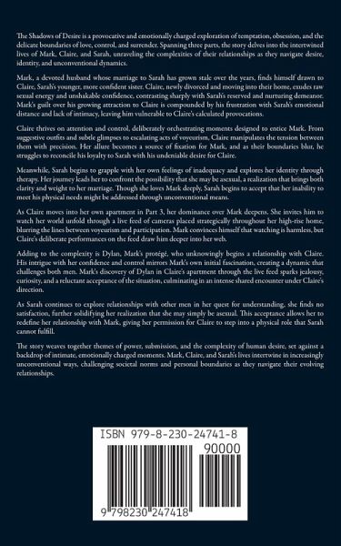 The Shadows of Desire is a provocative and emotionally charged exploration of temptation, obsession, and the delicate boundaries of love, control, and surrender. Spanning three parts, the story delves into the intertwined lives of Mark, Claire, and Sarah, unraveling the complexities of their relationships as they navigate desire, identity, and unconventional dynamics. Mark, a devoted husband whose marriage to Sarah has grown stale over the years, finds himself drawn to Claire, Sarah's younger, more confident sister. Claire, newly divorced and moving into their home, exudes raw sexual energy and unshakable confidence, contrasting sharply with Sarah's reserved and nurturing demeanor. Mark's guilt over his growing attraction to Claire is compounded by his frustration with Sarah's emotional distance and lack of intimacy, leaving him vulnerable to Claire's calculated provocations. Claire thrives on attention and control, deliberately orchestrating moments designed to entice Mark. From suggestive outfits and subtle glimpses to escalating acts of voyeurism, Claire manipulates the tension between them with precision. Her allure becomes a source of fixation for Mark, and as their boundaries blur, he struggles to reconcile his loyalty to Sarah with his undeniable desire for Claire. Meanwhile, Sarah begins to grapple with her own feelings of inadequacy and explores her identity through therapy. Her journey leads her to confront the possibility that she may be asexual, a realization that brings both clarity and weight to her marriage. Though she loves Mark deeply, Sarah begins to accept that her inability to meet his physical needs might be addressed through unconventional means. As Claire moves into her own apartment in Part 3, her dominance over Mark deepens. She invites him to watch her world unfold through a live feed of cameras placed strategically throughout her high-rise home, blurring the lines between voyeurism and participation. Mark convinces himself that watching is harmless, but Claire's deliberate performances on the feed draw him deeper into her web. Adding to the complexity is Dylan, Mark's protégé, who unknowingly begins a relationship with Claire. His intrigue with her confidence and control mirrors Mark's own initial fascination, creating a dynamic that challenges both men. Mark's discovery of Dylan in Claire's apartment through the live feed sparks jealousy, curiosity, and a reluctant acceptance of the situation, culminating in an intense shared encounter under Claire's direction. As Sarah continues to explore relationships with other men in her quest for understanding, she finds no satisfaction, further solidifying her realization that she may simply be asexual. This acceptance allows her to redefine her relationship with Mark, giving her permission for Claire to step into a physical role that Sarah cannot fulfill. The story weaves together themes of power, submission, and the complexity of human desire, set against a backdrop of intimate, emotionally charged moments. Mark, Claire, and Sarah's lives intertwine in increasingly unconventional ways, challenging societal norms and personal boundaries as they navigate their evolving relationships.