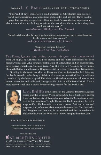 In the newest Vampire Huntress novel from national bestselling author, L. A. Banks, more than vampires are coming out to play. . . The Dark Realms are taking cover after an angel onslaught from On High. The Anti-Christ has been injured and the fourth Biblical seal has been broken. Yonnie and Val, a strange combination of a daywalker and an angel hybrid, have joined Damali and Carlos's team. And the two new Council Level vamps, Elizabeth Bathory and Lucrezia Borgia, are still in recovery from their last mission. Seething in the underworld is the Unnamed One, so furious that he's bringing the battle topside, unleashing a full-frontal assault on mankind for the offenses committed by the Vampire Huntress team. This time, Damali and Carlos must address serious human casualties and collateral damage...all while the vampire councilman, Nuit rebuilds Blood Music to become more than a record label, but a media brainwashing empire for the dark lord.