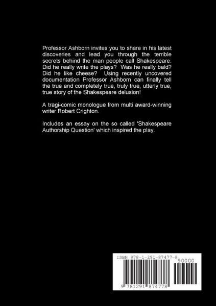 The Shakespeare Delusion is a new dramatic monologue by multi award-winning playwright Robert Crighton, exploring the madness behind the so called 'Shakespeare Authorship Question'. Professor Ashborn invites you to share in his latest discoveries and lead you through the terrible secrets behind the man people call Shakespeare. Did he really write the plays? Was he really bald? Did he like cheese? Using recently uncovered documentation Professor Ashborn can finally tell the true and completely true, truly true, utterly true, true story of the Shakespeare delusion! Includes a short essay on the nature of the so called 'Authorship Question' and why it is so important to not give in to attacks on Shakespeare's existence.