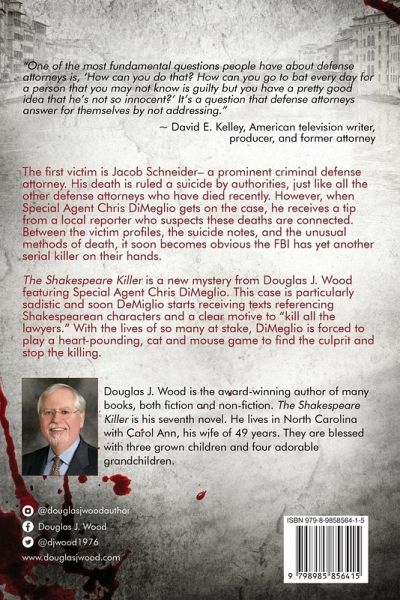The first victim is Jacob Schneider- a prominent criminal defense attorney. His death is ruled a suicide by authorities, just like all the other defense attorneys who have died recently. However, when Special Agent Chris DiMeglio gets on the case, he receives a tip from a local reporter who suspects these deaths are connected. Between the victim profiles, the suicide notes, and the unusual methods of death, it soon becomes obvious the FBI has yet another serial killer on their hands. The Shakespeare Killer is a new mystery from Douglas J. Wood featuring Special Agent Chris DiMeglio. This case is particularly sadistic and soon DeMiglio starts receiving texts referencing Shakespearean characters and a clear motive to "kill all the lawyers." With the lives of so many at stake, DiMeglio is forced to play a heart-pounding, cat and mouse game to find the culprit and stop the killing.