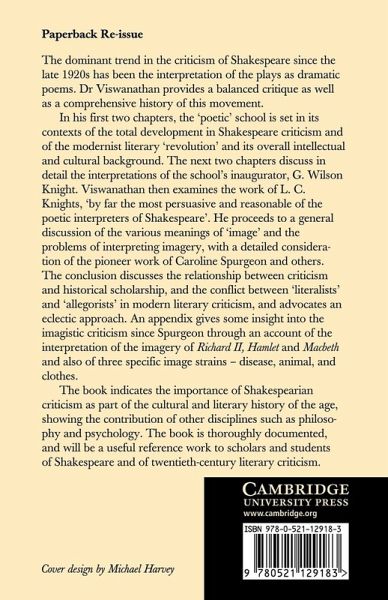The dominant trend in the criticism of Shakespeare since the late 1920s has been the interpretation of the plays as dramatic poems. Dr Viswanathan provides a balanced critique as well as a comprehensive history of this movement. The book concludes by discussing the relationship between criticism and historical scholarship, and the conflict between 'literalists' and 'allegorists' in modern literary criticism, and advocates an eclectic approach. The book indicates the importance of Shakespearian criticism as part of the cultural and literary history of the age, showing the contribution to other disciplines such as philosophy and psychology. The book is thoroughly documented, and will be a useful reference work to scholars and students of Shakespeare and of twentieth-century literary criticism.