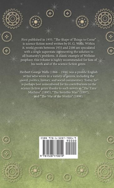 First published in 1933, "The Shape of Things to Come" is science fiction novel written by H. G. Wells. Within it, world events between 1933 and 2106 are speculated with a single superstate representing the solution to all humanity's problems. A classic example of Wellsian prophesy, this volume is highly recommended for fans of his work and of the science fiction genre. Herbert George Wells (1866 - 1946) was a prolific English writer who wrote in a variety of genres, including the novel, politics, history, and social commentary. Today, he is perhaps best remembered for his contributions to the science fiction genre thanks to such novels as "The Time Machine" (1895), "The Invisible Man" (1897), and "The War of the Worlds" (1898). Many vintage books such as this are becoming increasingly scarce and expensive. We are republishing this book now in an affordable, modern, high-quality edition complete with a specially commissioned new biography of the author.
