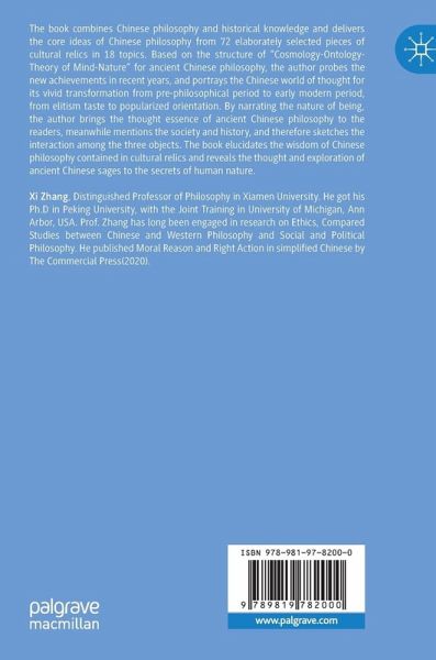 The book combines Chinese philosophy and historical knowledge and delivers the core ideas of Chinese philosophy from 72 elaborately selected pieces of cultural relics in 18 topics. Based on the structure of "Cosmology-Ontology-Theory of Mind-Nature" for ancient Chinese philosophy, the author probes the new achievements in recent years, and portrays the Chinese world of thought for its vivid transformation from pre-philosophical period to early modern period, from elitism taste to popularized orientation. By narrating the nature of being, the author brings the thought essence of ancient Chinese philosophy to the readers, meanwhile mentions the society and history, and therefore sketches the interaction among the three objects. The book elucidates the wisdom of Chinese philosophy contained in cultural relics and reveals the thought and exploration of ancient Chinese sages to the secrets of human nature.