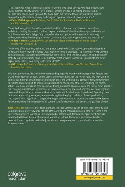 This book provides readers with the understanding required to analyse the range of key factors that shape the production of news, and to assess their implications for the role of news and journalism in democracy. It brings existing research together under the umbrella of a central organising framework to explore how news and its production is shaped by a multiplicity of factors including the norms, values, role perceptions and ethics associated with journalism as a profession, the role of news sources, the changing character and significance of news audiences, the aims and objectives of news organisations, and the political, economic and social contexts within which news is produced. Exploring these factors in depth, using examples, and considering the changing conditions of news production, the chapters chart significant changes, challenges, and responses to provide the essential background for understanding the consequences of current transformations for the democratic qualities of news.