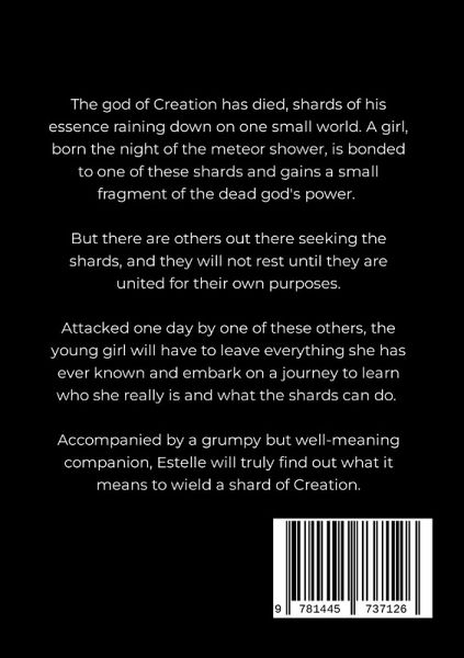 The god of Creation has died, shards of his essence raining down on one small world. A girl, born the night of the meteor shower, is bonded to one of these shards and gains a small fragment of the dead god's power. But there are others out there seeking the shards, and they will not rest until they are united for their own purposes. Attacked one day by one of these others, the young girl will have to leave everything she has ever known and embark on a journey to learn who she really is and what the shards can do. Accompanied by a grumpy but well-meaning companion, Estelle will truly find out what it means to wield a shard of Creation.
