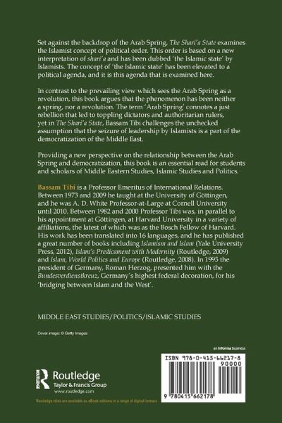 Set against the backdrop of the Arab Spring, The Sharia State examines the Islamist concept of political order. This order is based on a new interpretation of sharia and has been dubbed "the Islamic state" by Islamists. The concept of "the Islamic state," has been elevated to a political agenda and it is this agenda that is examined here. In contrast to the prevailing view which sees the Arab Spring as a revolution, this book argues that the phenomenon has been neither a Spring, nor a revolution. The term 'Arab Spring,' connotes a just rebellion that led to toppling dictators and authoritarian rulers, yet in The Sharia State, Bassam Tibi challenges the unchecked assumption that the seizure of leadership by Islamists is a part of the democratization of the Middle East. Providing a new perspective on the relationship between the Arab Spring and democratization, this book is an essential read for students and scholars of Middle Eastern Studies, Islamic Studies and Politics.