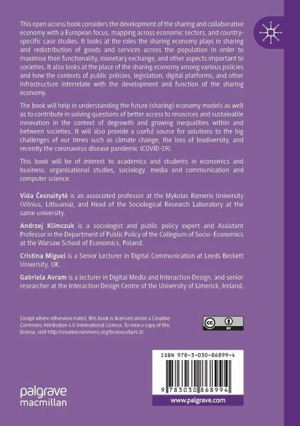 This open access book considers the development of the sharing and collaborative economy with a European focus, mapping across economic sectors, and country-specific case studies. It looks at the roles the sharing economy plays in sharing and redistribution of goods and services across the population in order to maximise their functionality, monetary exchange, and other aspects important to societies. It also looks at the place of the sharing economy among various policies and how the contexts of public policies, legislation, digital platforms, and other infrastructure interrelate with the development and function of the sharing economy.
