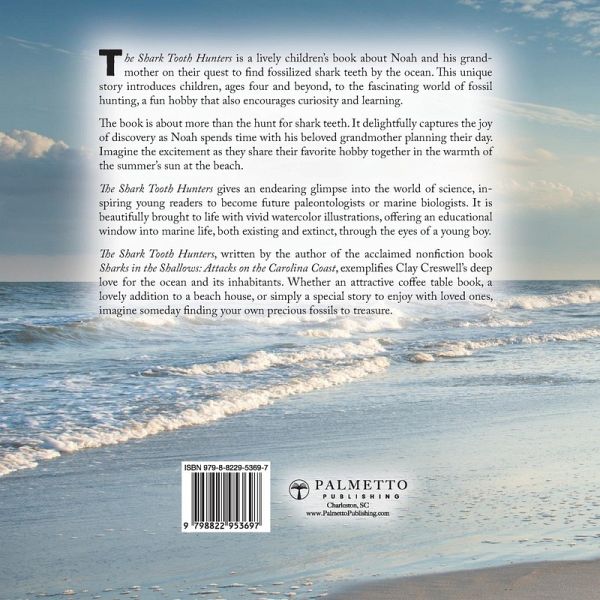 Join Noah's exciting ocean adventure! Discover the joy of fossil hunting, learn about ancient sharks, and explore the beauty of nature. Perfect for budding scientists and beach lovers alike! The Shark Tooth Hunters is a vibrant children's book that takes you on a thrilling journey with Noah and his grandmother. Their hobby? Hunting for fossilized shark teeth along the ocean strand. This delightful tale offers a peek into the exciting world of fossil hunting, a hobby that is not just fun but also sparks curiosity and learning. Every page of this book is a testament to the thrill of discovery. It's not just about finding shark teeth. It's about the joy of being outdoors, feeling the warmth of the sun, hearing the sounds of the sea, and witnessing the beauty of the ever-changing ocean. It's about understanding the fascinating creatures of the sea, both present and those that swam millions of years ago. The Shark Tooth Hunters is more than just a story. It's a tool to inspire our future scientists, paleontologists, and marine biologists. It encourages young readers to contribute to science and research while finding treasures that will be cherished for a lifetime. This book is beautifully illustrated, combining the thrill of Noah's adventure with captivating watercolor pictures. It's a perfect read for children aged 4 and up. It also makes a wonderful coffee table display or a charming addition to a beach house. This book is a great fit for ocean area gift shops, piers, museums, and aquariums. From the author of the successful nonfiction book Sharks in the Shallows: Attacks on the Carolina Coast, The Shark Tooth Hunters is another testament to the author's love for the ocean and its creatures. It would be a delight to market these two books together at events. Dive into this adventure and let your curiosity lead the way!