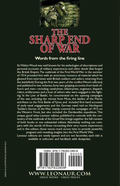 Words from the firing line Sir Walter Wood was well known for his anthologies of descriptions and personal accounts of military experiences and other deeds that forged the British Empire. The outbreak of the First World War in the summer of 1914 provided him with an enormous resource of material which he gleaned from interviews with British soldiers and sailors returning from the battlefield. During the first two years of the conflict Wood collected, and published in two volumes, forty two gripping accounts, from both officers and men-including cavalrymen, infantrymen, engineers, dispatch riders, artillerymen and a host of others who were engaged in the fighting. 'In the Line of Battle,' he concentrated on the opening campaigns of the war, including the retreat from Mons, the battles of the Marne and Aisne to the First Battle of Ypres, and included first hand accounts of early naval engagements and the German naval raid on Hartlepool. 'Soldiers Stories of the War,' mainly covered the campaigns of 1915 on the Western Front, but also included the Dardanelles expedition. This unique, good value Leonaur edition, published to coincide with the centenary of the outbreak of the Great War, brings together the full content of both books in one substantial edition. Absolutely nothing can compare with the words of those recounting their very recent experiences and in this edition, those voices reach across time to provide powerful, poignant and revealing insights into the First World War. Leonaur editions are newly typeset and are not facsimiles; each title is available in softcover and hardback with dustjacket.