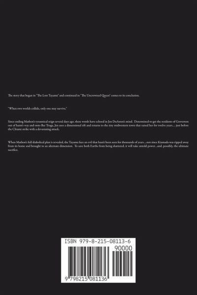 The story that began in "The Lost Tayamu" and continued in "The Uncrowned Queen" comes to its conclusion…… "When two worlds collide, only one may survive." Since ending Mathon's tyrannical reign several days ago, these words have echoed in Jen DuAston's mind. Determined to get the residents of Groverton out of harm's way and onto Bar Truga, Jen uses a dimensional rift and returns to the tiny midwestern town that raised her for twelve years…. just before the Chiami strike with a devastating attack. When Mathon's full diabolical plan is revealed, the Tayamu face an evil that hasn't been seen for thousands of years….not since Kiamada was ripped away from its home and brought to an alternate dimension. To save both Earths from being shattered, it will take untold power…and, possibly, the ultimate sacrifice.