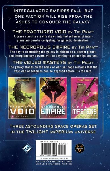 Three astounding space operas set in the Twilight Imperium universe The Fractured Void A brave starship crew are drawn into the schemes of interplanetary powers competing for galactic domination. The Necropolis Empire The key to controlling the galaxy is hidden on a distant planet, and interplanetary powers will do anything to unlock its secrets. The Veiled Masters The galaxy stands on the brink of war, yet hope remains that the vast web of schemes can be exposed before it's too late.