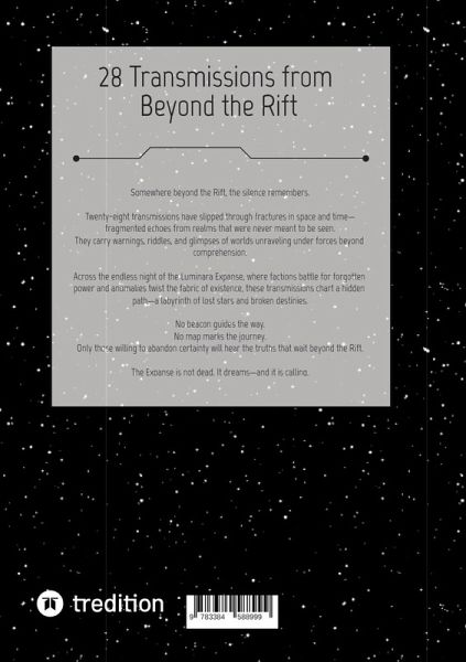 The Shattered Nexus is part of The Luminara Expanse - a vast, lore-rich science fiction universe where cosmic anomalies, warring factions, and ancient artifacts shape the destiny of countless worlds.Across the fractured regions of the Expanse, 28 mysterious transmissions have surfaced - messages lost in the aftermath of collapsing stars and dimensional ruptures. Each transmission reveals fragments of forgotten civilizations, whispered warnings from beyond, and glimpses into the hidden wars that ripple through space and time.This book offers a haunting journey into a universe where reality itself bends, and where survival means deciphering the secrets hidden between the stars.