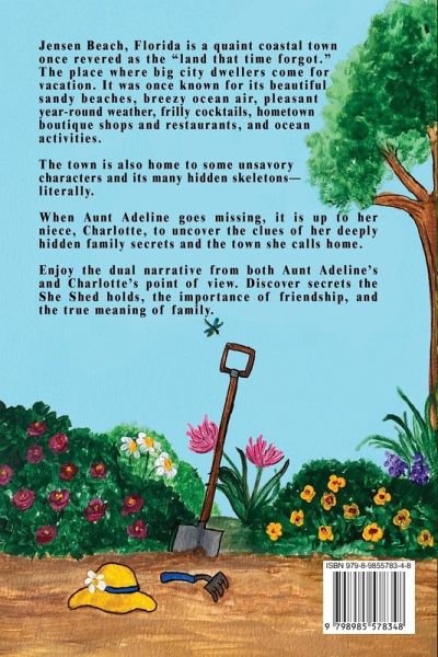 Jensen Beach, Florida is a quaint coastal town once revered as the "land that time forgot." The place where big city dwellers come for vacation. It was once known for its beautiful sandy beaches, breezy ocean air, pleasant year-round weather, frilly cocktails, hometown boutique shops and restaurants, and ocean activities. The town is also home to some unsavory characters and its many hidden skeletons-literally. When Aunt Adeline goes missing, it is up to her niece, Charlotte, to uncover the clues of her deeply hidden family secrets and the town she calls home. Enjoy the dual narrative from both Aunt Adeline's and Charlotte's point of view. Discover secrets the She Shed holds, the importance of friendship, and the true meaning of family.