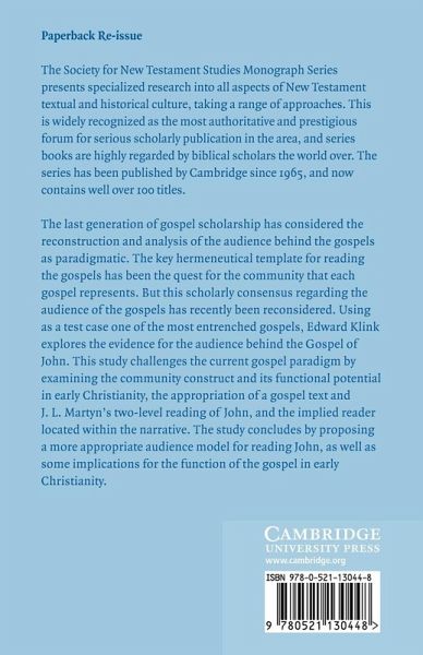 The last generation of gospel scholarship has considered the reconstruction and analysis of the audience behind the gospels as paradigmatic. The key hermeneutical template for reading the gospels has been the quest for the community that each gospel represents. This scholarly consensus regarding the audience of the gospels has been reconsidered. Using as a test case one of the most entrenched gospels, Edward Klink explores the evidence for the audience behind the Gospel of John. This study challenges the prevailing gospel paradigm by examining the community construct and its functional potential in early Christianity, the appropriation of a gospel text and J. L. Martyn's two-level reading of John, and the implied reader located within the narrative. The study concludes by proposing a more appropriate audience model for reading John, as well as some implications for the function of the gospel in early Christianity.
