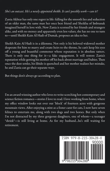 She's an outcast. He's a newly appointed sheikh. It can't possibly work-can it? Zania Akhtar has only one regret in life: falling for the smooth lies and seduction of an older man, the same man her once best friend and Sheikha of Imbranak imagined herself in love with. Now Zania is scorned by her friends and strangers alike, and with no money and apparently even less values, she has no one to turn to-until Sheikh Kain Al Hadi of Dumak, proposes an idea to her. Sheikh Kain Al Hadi is in a dilemma. Not only is his beloved widowed mother desperate for him to marry and create heirs to the throne, he can't keep his eyes off a young and beautiful commoner whose reputation is in absolute tatters. There is only one thing for it-a fake engagement. It will restore Zania's reputation while getting his mother off his back about marriage and babies. Then once the dust settles, his libido is quenched and her mother realizes her mistake, he and Zania can go their separate ways. But things don't always go according to plan.