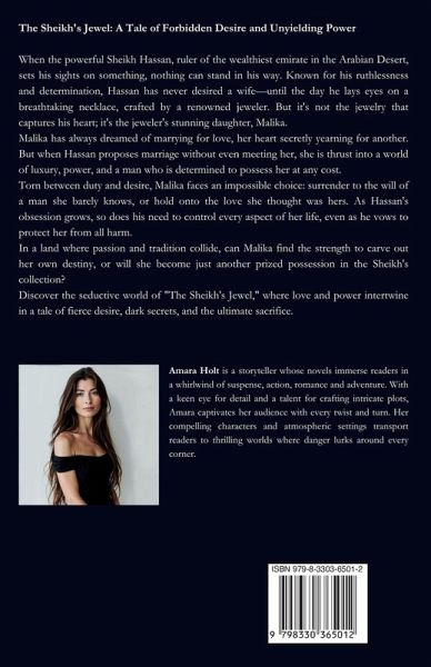 The Sheikh's Jewel: A Tale of Forbidden Desire and Unyielding Power When the powerful Sheikh Hassan, ruler of the wealthiest emirate in the Arabian Desert, sets his sights on something, nothing can stand in his way. Known for his ruthlessness and determination, Hassan has never desired a wife-until the day he lays eyes on a breathtaking necklace, crafted by a renowned jeweler. But it's not the jewelry that captures his heart; it's the jeweler's stunning daughter, Malika. Malika has always dreamed of marrying for love, her heart secretly yearning for another. But when Hassan proposes marriage without even meeting her, she is thrust into a world of luxury, power, and a man who is determined to possess her at any cost. Torn between duty and desire, Malika faces an impossible choice: surrender to the will of a man she barely knows, or hold onto the love she thought was hers. As Hassan's obsession grows, so does his need to control every aspect of her life, even as he vows to protect her from all harm. In a land where passion and tradition collide, can Malika find the strength to carve out her own destiny, or will she become just another prized possession in the Sheikh's collection? Discover the seductive world of "The Sheikh's Jewel," where love and power intertwine in a tale of fierce desire, dark secrets, and the ultimate sacrifice.
