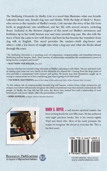 The Shelbydog Chronicles by Shelby Cole is a novel that illustrates what one brindle Labrador-Boxer mix, female dog says and thinks. With the help of Mark G. Boyer, who serves as the recorder of Shelby's words, Cole narrates the story of her life from birth, to puppyhood, into adulthood, and her life with several owners, including Boyer. Included in the thirteen chapters of this novel are Shelby's adventures and birthdays up to her tenth human year and sixty-seventh dog year. She also tells the story of how she came to live with Boyer and how he has become her translator from dog talk to…mehr