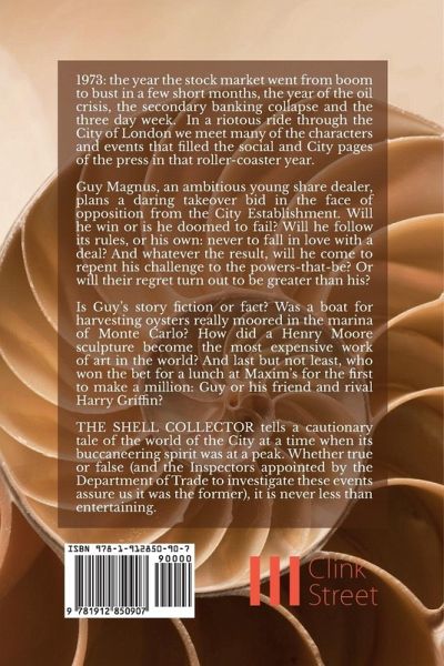 1973: the year of the oil crisis, the secondary banking collapse, the three day working week and the collapse of the stock market. In a riotous ride through the City of London we meet the characters and events that filled the social and City pages of the press in that roller-coaster year. Guy Magnus, an ambitious young share dealer, makes a daring takeover bid in the face of opposition from the City Establishment. Will he follow their rules, or his own: never to fall in love with a deal? Will he come to repent his challenge to the powers-that-be? Is Guy’s story fiction or fact? Was a Norfolk Broads canal boat really moored in the marina of Monte Carlo? Did a Henry Moore sculpture really become the most expensive work of art in the world? And did a bet for a lunch at Maxim’s for the first to make a million, Guy or his friend and rival Harry Griffin, bring a merchant bank to the verge of collapse? THE SHELL COLLECTOR tells a cautionary tale of the City when its buccaneering spirit was at a peak. Whether true or false, it is never less than entertaining.