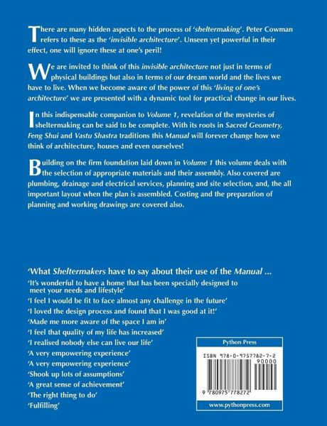 There are many hidden aspects to the process of 'sheltermaking'. Peter Cowman refers to these as the 'invisible architecture'. Unseen yet powerful in their effect, one will ignore these at one's peril! We are invited to think of this invisible architecture not just in terms of physical buildings but also in terms of our dream world and the lives we have to live. When we become aware of the power of this 'living of one's architecture' we are presented with a dynamic tool for practical change in our lives. In this indispensable companion to Volume 1, revelation of the mysteries of sheltermaking can be said to be complete. With its roots in Sacred Geometry, Feng Shui and Vastu Shastra traditions this Manual will forever change how we think of architecture, houses and even ourselves! Building on the firm foundation laid down in Volume 1 this volume deals with the selection of appropriate materials and their assembly. Also covered are plumbing, drainage and electrical services, planning and site selection, and, the all important layout when the plan is assembled. Costing and the preparation of planning and working drawings are covered also.